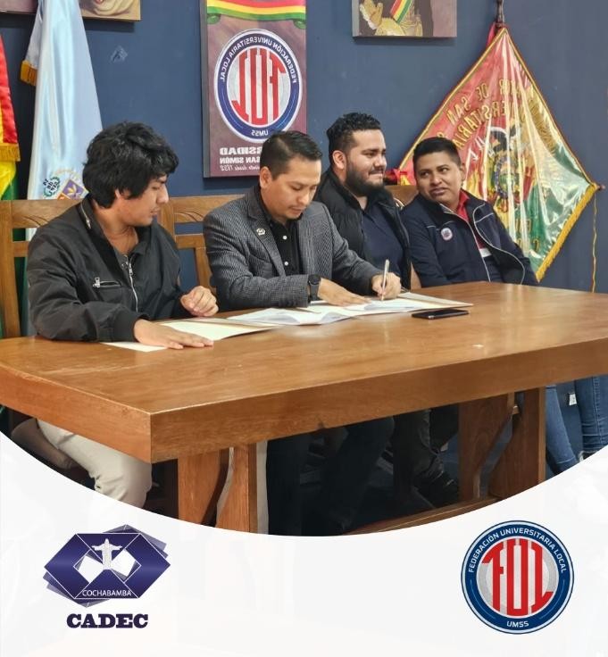 El Colegio de Profesionales en Ciencias Administrativas y Empresariales de Cochabamba (CADEC) y la Federación Universitaria Local (FUL) de la Universidad Mayor de San Simón firmaron un Convenio Específico de Cooperación Interinstitucional con el objetivo de coordinar acciones conjuntas que beneficien a ambas instituciones, permitiendo así la participación de estudiantes y profesionales en programas de prácticas empresariales, mentorías y ferias laborales, en proyectos de investigación académica y extensión social, y en el acceso a cursos de postgrado, seminarios y actividades de integración profesional-universitaria, así como también la gestión de fondos para becas y apoyo a iniciativas estudiantiles para el desarrollo de proyectos sociales y profesionales.